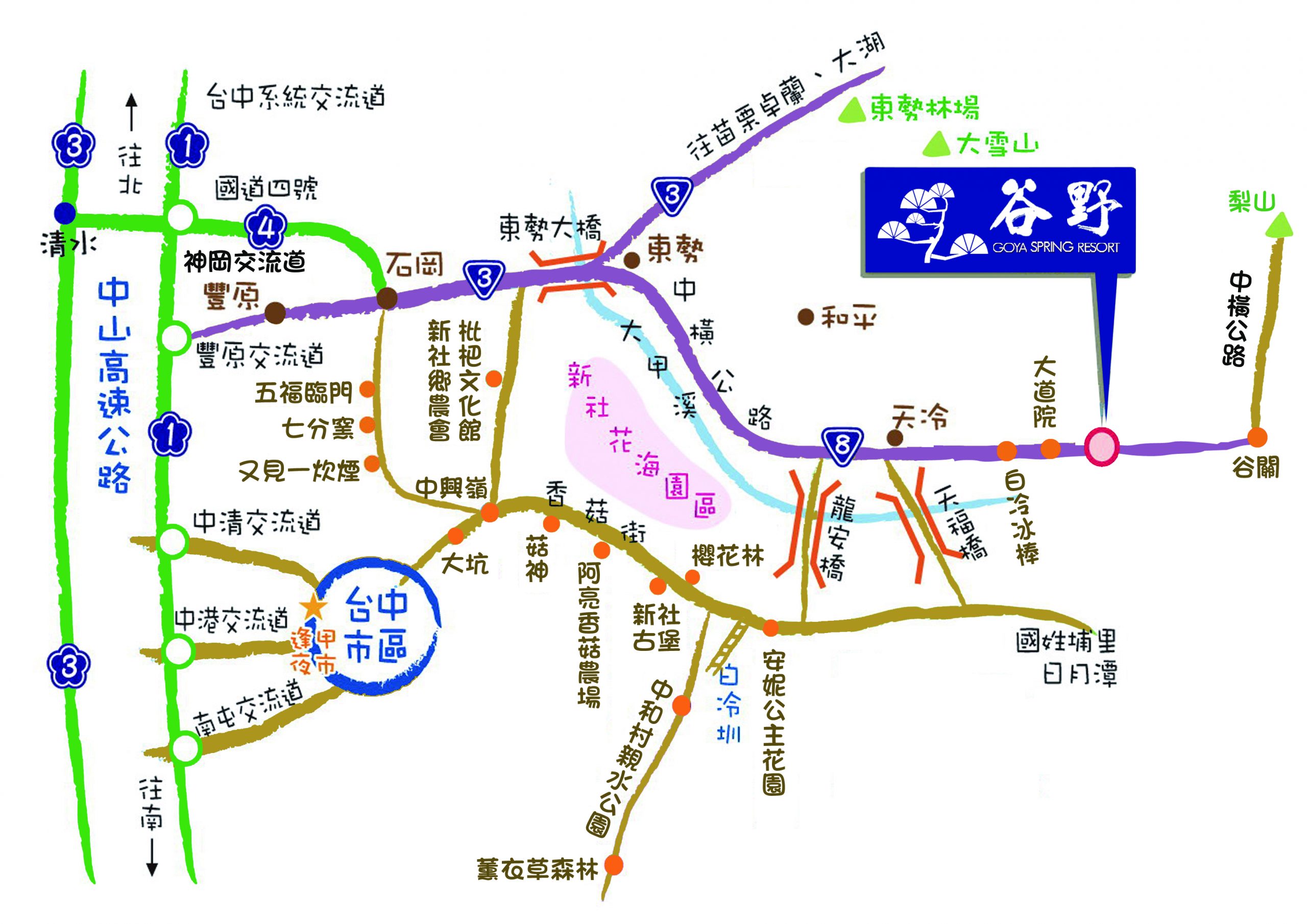 Transportation交通指南 自行開車Driving car◎走中山高從中山高南下、北上→166公里處轉接國道4號往「豐勢」交流道下→左轉接3號省道往石岡-東勢方向→過東勢大橋右轉中橫公路(台8線)往谷關方向→26公里處裡冷橋右轉即可進入裡冷部落◎走二高南下請在新竹系統轉接中山高,北上請在彰化系統轉接中山高→中山高166公里處轉接國道4號往「豐勢」交流道下東勢方向,後同上。 Google 導航 大眾交通工具Mass transportation